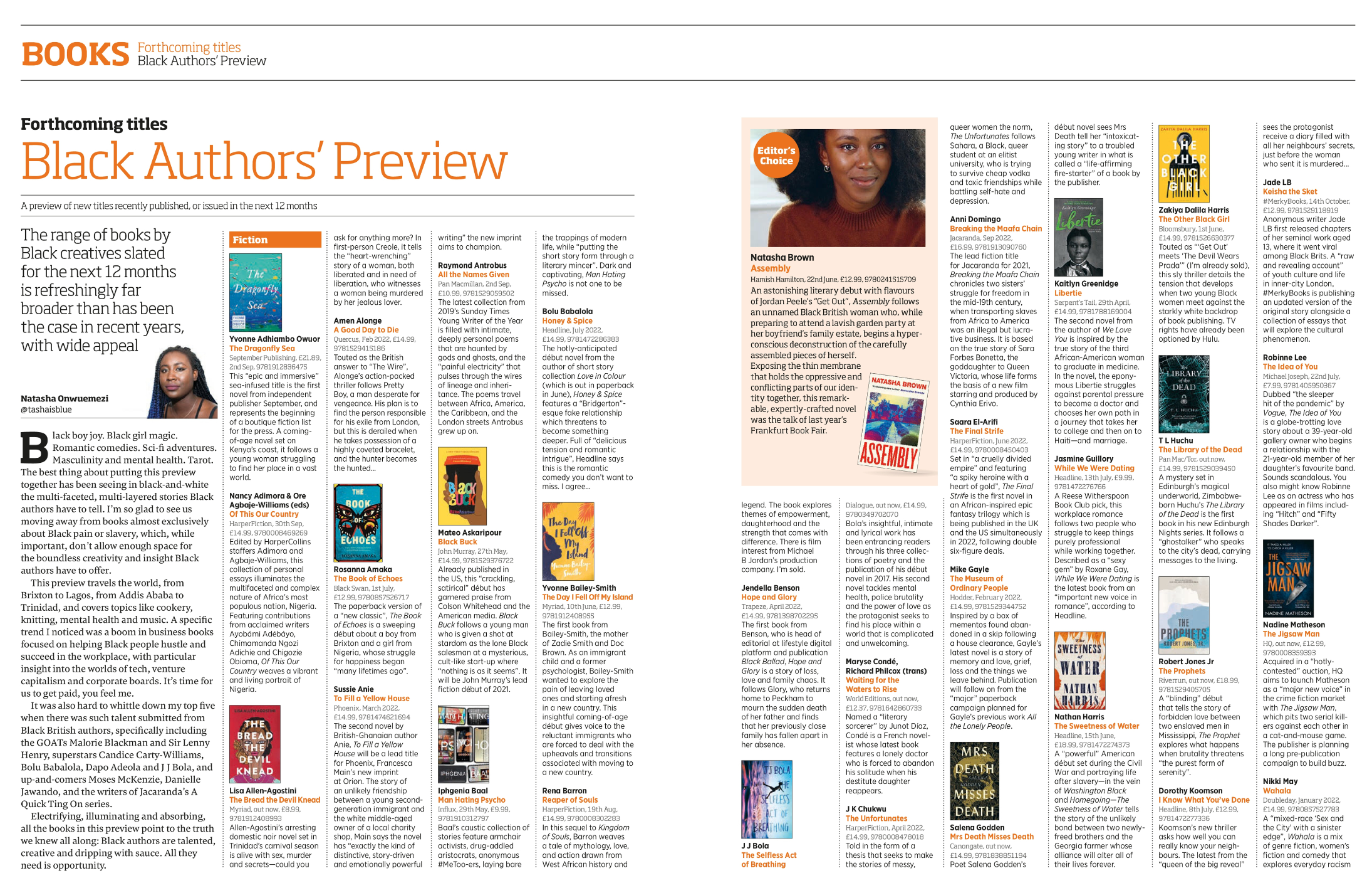 I previewed around 200 books (whittled down from 350 submissions) for a nine-page preview of books by Black authors for leading trade magazine The Bookseller.