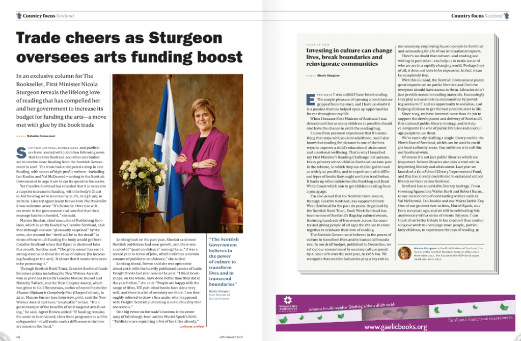 I led the editorial coverage of these issues, and since its inception in 2017 we managed to secure £80,000 in new revenue (around 80% of annual revenue). The last issue I worked on (in January 2019) had 14 separate features covering topics from micropresses to women’s writing which I commissioned and edited, and included interviews I secured with Nicola Sturgeon, Irvine Welsh and Graeme Macrae Burnet.